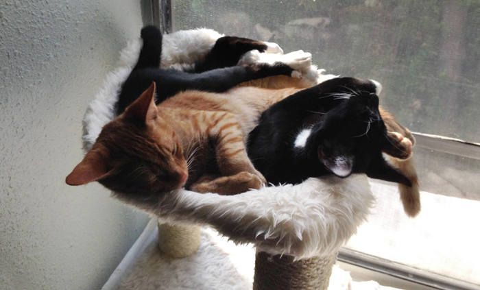 These two cute adopted brothers still share their bed together, despite no longer being kittens or even able to properly fit, now that’s love 🙂